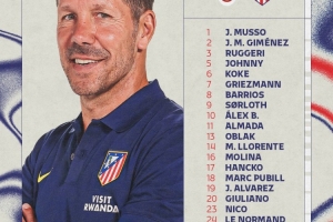 1-穆索、2-吉梅内斯、3-鲁杰里、5-乔尼、6-科克、7-格列兹曼、8-巴里奥斯、9-瑟尔洛特、10-巴埃纳、11-阿尔马达、13-奥布拉克、14-马科斯·略伦特、16-莫利纳、17-汉茨科、18-普比尔、19-阿尔瓦雷斯、20-朱利亚诺·西蒙尼、23-尼科、24-勒诺尔芒、28-陶菲克·塞义杜、29-拉亚内·贝莱德、31-埃斯奎维尔、34-胡里奥·迪亚斯、37-伊克尔·卢克