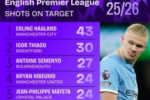 本赛季英超射正榜: