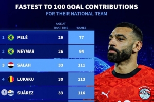 体育资讯1月11日讯 埃及在非洲杯八强战3-2淘汰科特迪瓦,萨拉赫传射建功,也达成了国家队直接参与100球里程碑。《转会市场》统计显示他也是历史第三快达成国家队直接参与100球的球员。