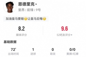 体育资讯1月12日讯 里昂在本轮法国杯对阵里尔,从皇马租借加盟的新援恩德里克本场数据如下: